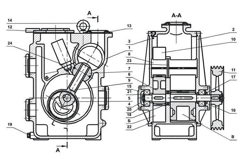1 – корпус; 2 и 3 – крышки передняя и задняя; 4 – вал; 5 и 6 – эксцентрики; 7 и 8 – направляющие; 9 и 10 – плунжеры; 11 – маховик; 12 – крышка; 13 и 22 – кольцо; 14 – рым-болт; 15 и 16 – крышки; 17 и 18 – манжеты; 19 – пробка; 20 – подшипник; 21 – шайба; 23 – перегородка; 24 – клапан; Б и В - роторные камеры